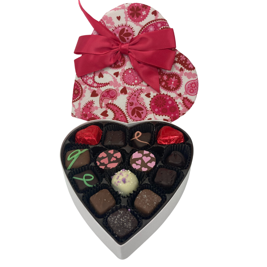 Heart #17. Milk and Dark Chocolate Valentine's Day Assortment in a Pink Paisley Heart Shaped Box. Net weight approximately 5 oz.