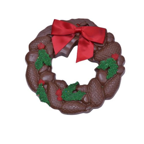 9.2 ounches of sweet milk chocolate is molded into a classic Christmas wreath with non-pareil seed decorations added by hand to highlight the holly! This beautiful chocolate wreath might look good hanging up on a door, but it looks even better wrapped up as a gift for a chocolate lover.