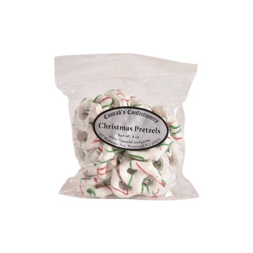 4 ounce package of mini pretzels covered in yogurt with a red and green sugar drizzle