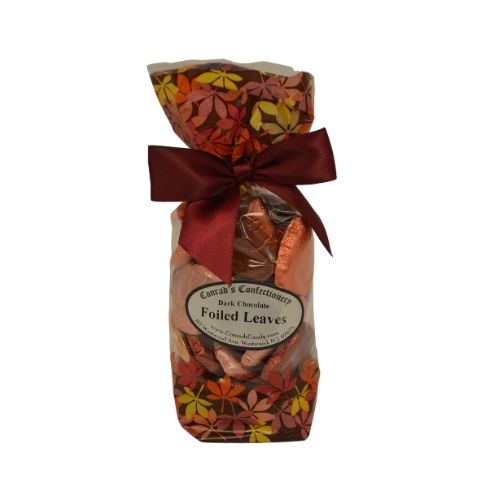 Dark chocolate in the shape of leaves wrapped in foil in a decorative 8 oz bag