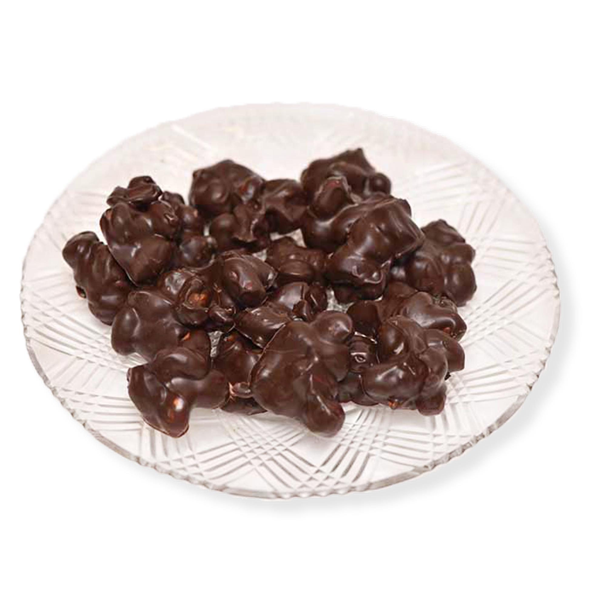 Peanuts hand dipped in dark chocolate and dropped into bite-sized clusters.