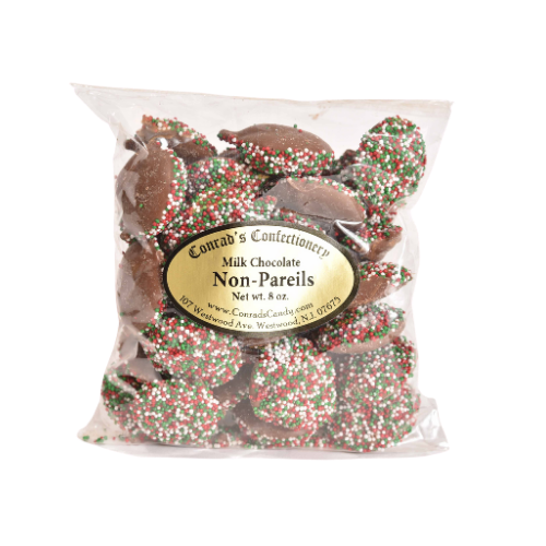 8 ounce package of Conrad's Famous Milk Chocolate Non Pareils in Christmas colors.
